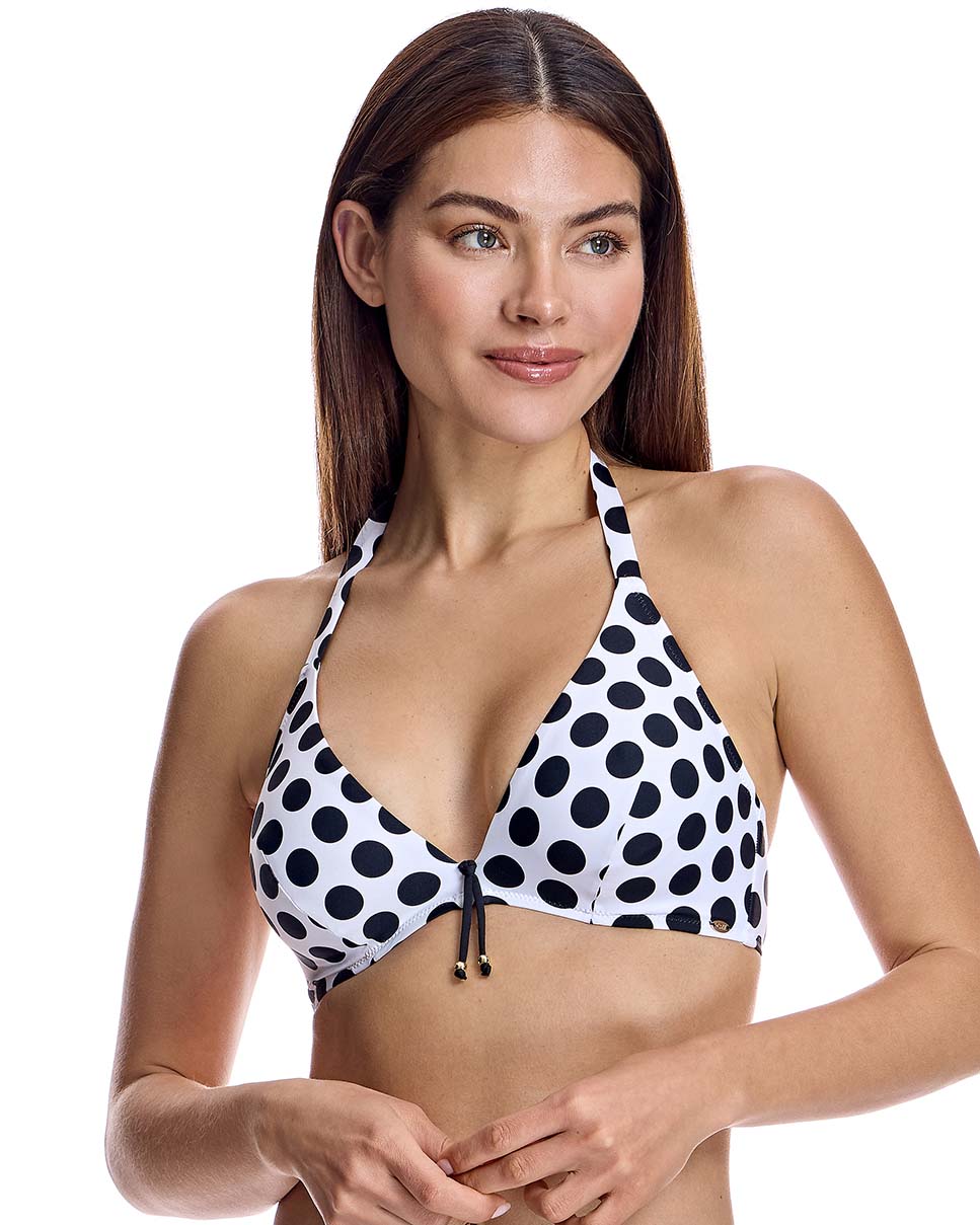 Top bikini capacidad escotado con aro estampado vintage lunares. Espalda completamente forrada. Disponible en copa C, D y E. Tejido de vanguardia con un alto poder moldeador, con una alta resistencia al cloro, cremas y aceites bronceadores y excelentes propiedades de absorción de la humedad.